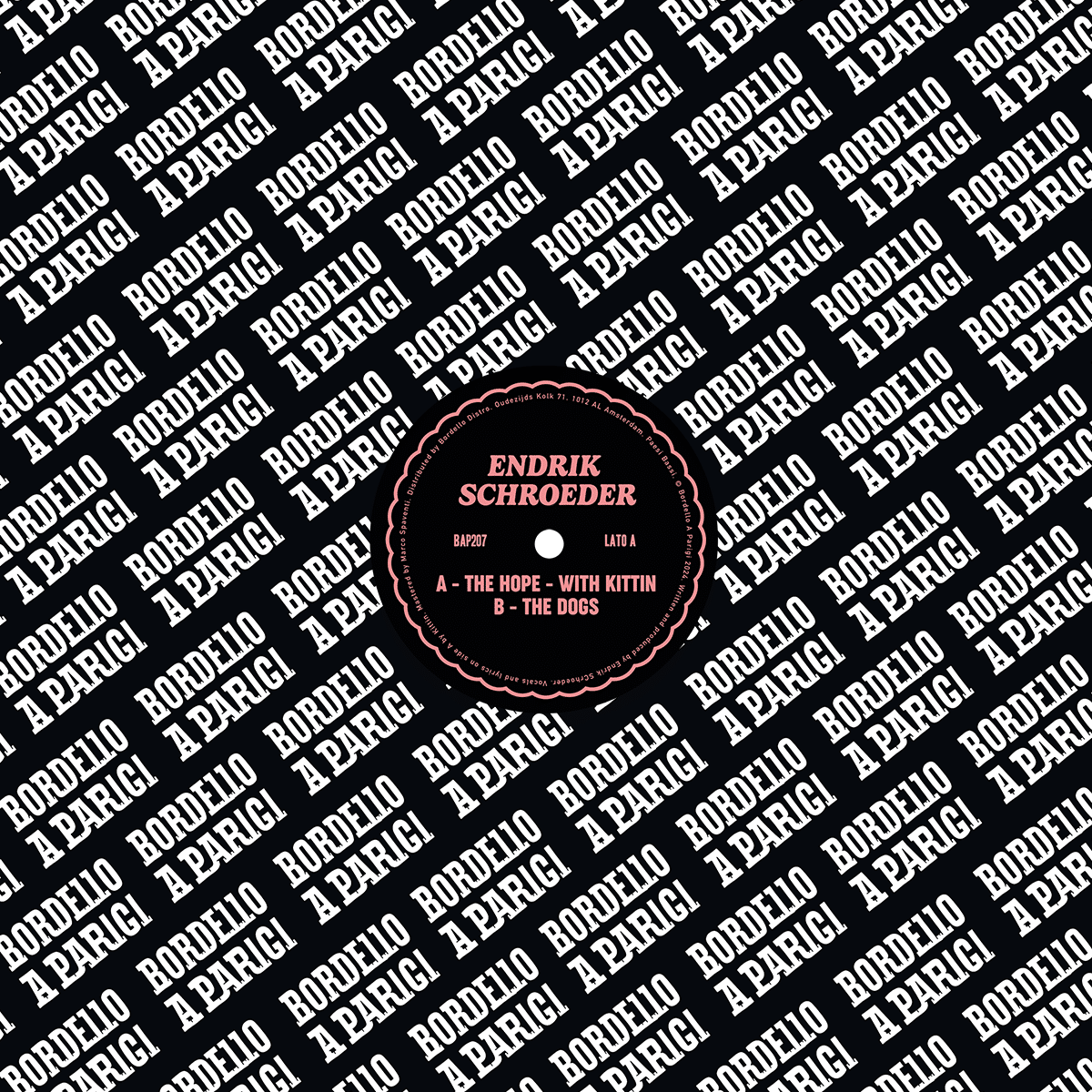 In 2021, we welcomed Endrik Schroeder to the Bordello family with his Second Breath 12”. The memorable hooks and attention to detail that characterised his first appearance run deep in his latest. The Hope sees the French producer accompanied by a true legend of electronics, Caroline Hervé aka Kittin. Hervé’s penchant for combining brighter tones with darker shades is evident from the needle. Industrial hiss pierces swirling vocals. Clean claps, warm bass and crystalline chords give way to woe-streaked lyrics, lyrics that ascend into an arc of pulsating synthwave pain. Schroeder takes the reins on the flip. A beam of light is cast over throbbing arpeggios and a slicing snare, notes drifting ever higher as “The Dogs” takes hold. Strings swim as a spread of sounds grow, a palpable energy building under Schroeder’s watchful ear and hand in this seven minute plus odyssey into his machines.
