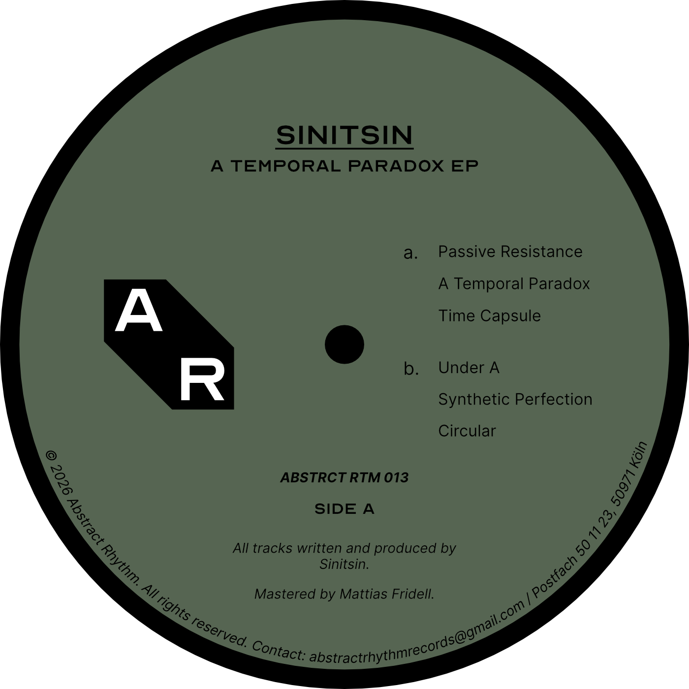 Sinitsin is back on Abstract Rhythm, this time with a full EP of six strong and versatile Electro tracks, called “A Temporal Paradox”. A Temporal Paradox is a hypothetical contradiction of cause-and-effect within a timeline. The tracks contain everything from deep and subby to higher frequency driving basslines, subtle to distorted acid sequences, warm pads and melodies to harsh percussion sounds, from smooth floating grooves to energetic, dancefloor ready gems, while overall having the ability to make you travel through time and space, bringing you closer to the Temporal Paradox.